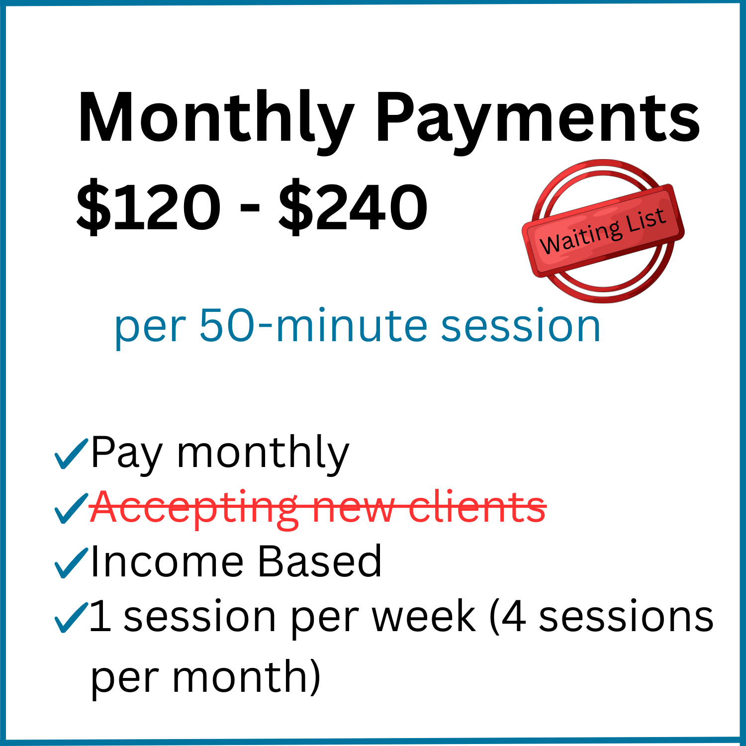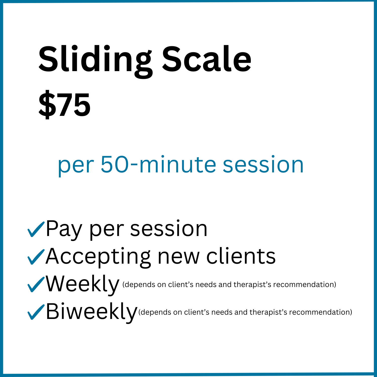 An informational sign with a light blue background and dark blue border, displaying pricing and details for a therapy session. It reads: "Standard Price $140 per 50-minute session. Pay per session, Accepting new clients, Weekly, Biweekly."